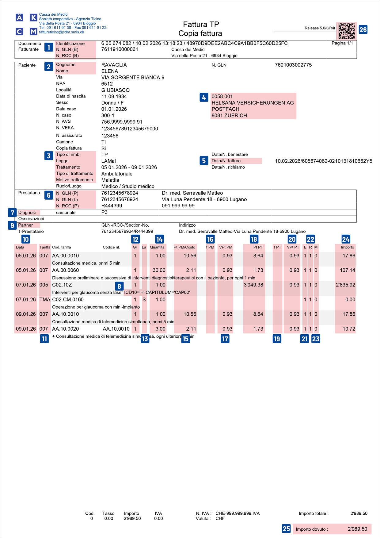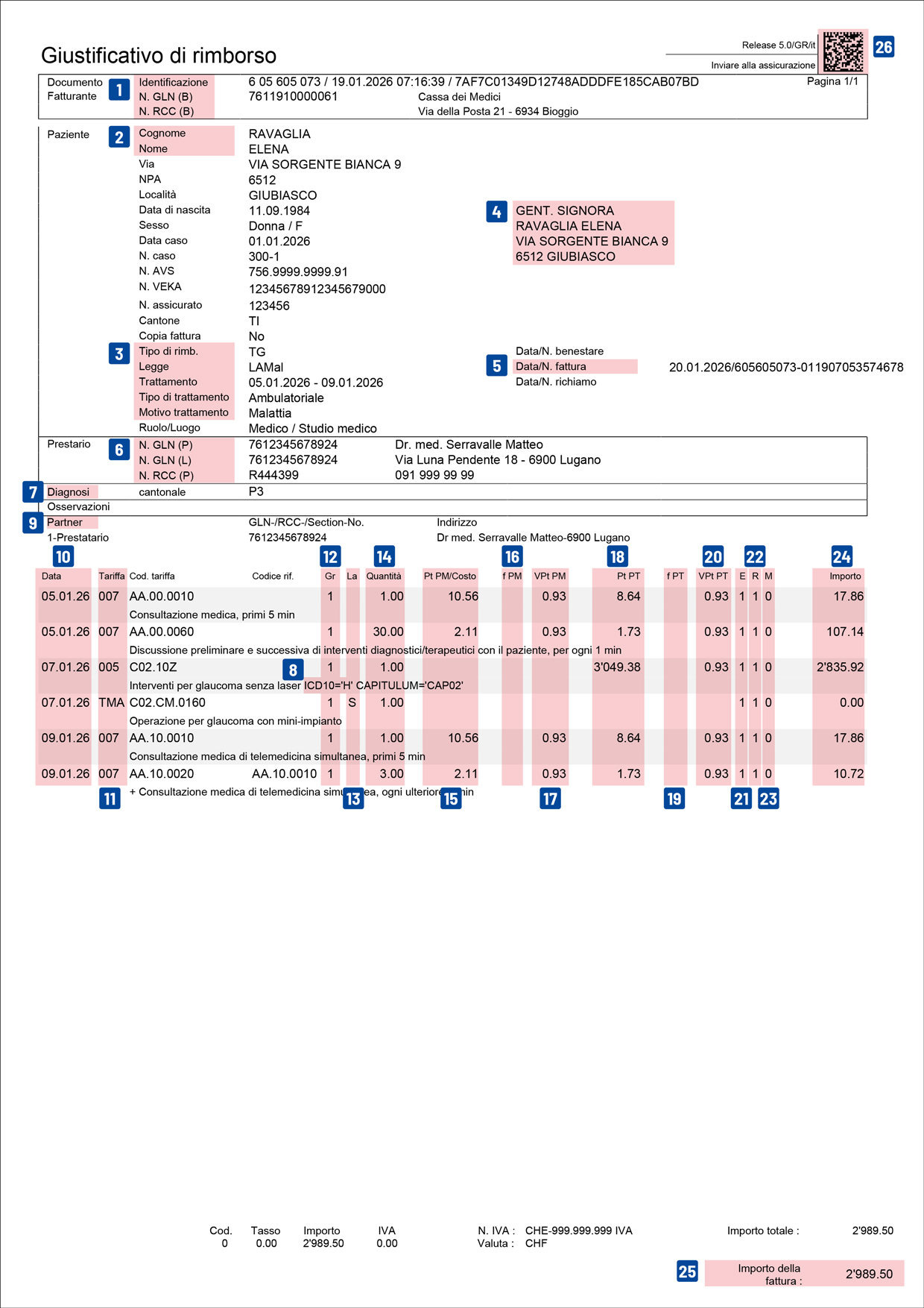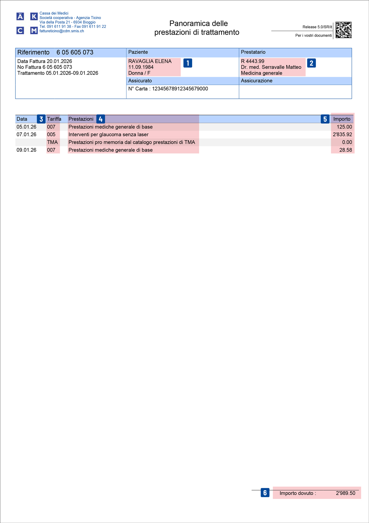 Ogni fattura TARDOC comprende un giustificativo di rimborso con codici QR. Questi codici QR contengono i dati di fatturazione in formato elettronico e sono destinati alla cassa malati.