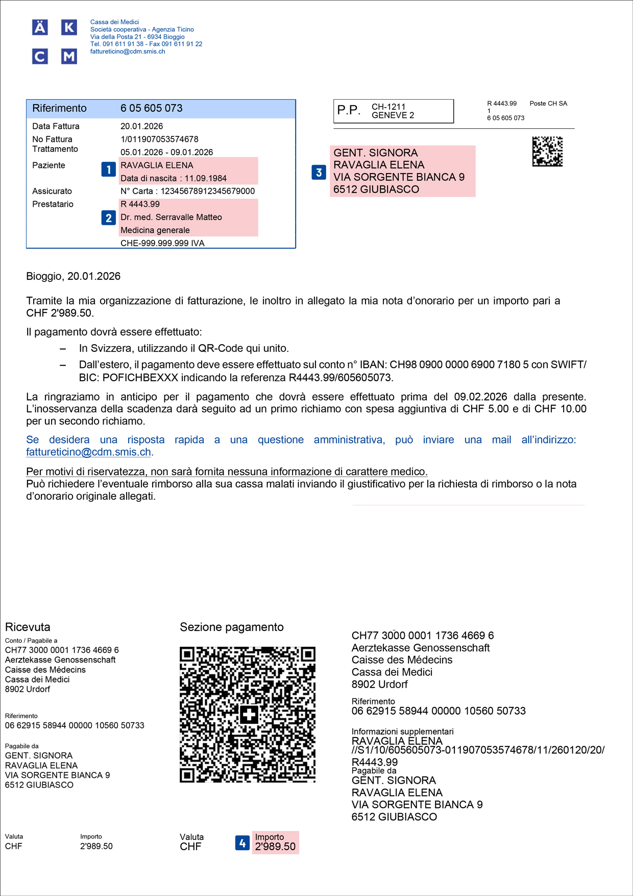 Lo studio medico e l’assicurazione malattia regolano il pagamento direttamente tra loro. Sebbene il processo sia automatizzato, ogni paziente ha il diritto di ricevere una copia della fattura per verificarne il contenuto. È possibile riceverla anche in formato digitale: comunicando il proprio indirizzo e-mail durante la prossima visita, si riceverà un link protetto per accedere comodamente al documento online.